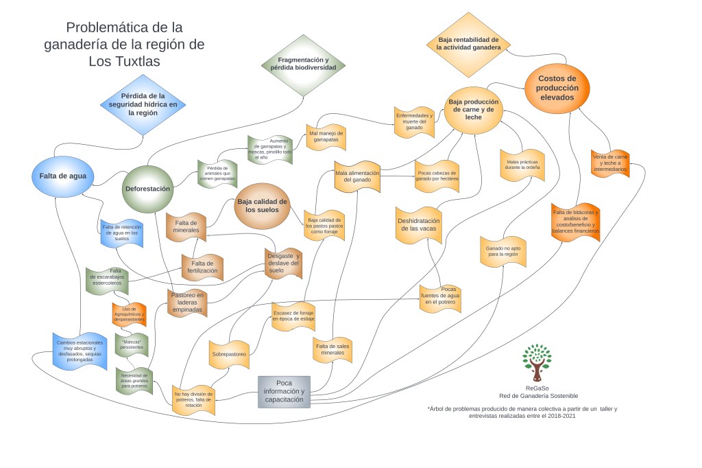 Para implementar prácticas de ganadería sostenible, consolidamos un flujo de trabajo que inicia con una reflexión colectiva para entender cuáles son las raíces de los problemas en la ganadería. Por ejemplo, se han detectado la falta de capacitación, el uso de grandes extensiones de potreros sin rotación del ganado, el sobrepastoreo, la eliminación de fuentes de agua locales y la siembra de forrajes de baja calidad como algunos problemas de raíz, que, a su vez, desencadenan toda una red de problemas. A partir de la información compartida en diversos talleres y en entrevistas con integrantes del colectivo hemos resumido esta problemática en la siguiente figura.